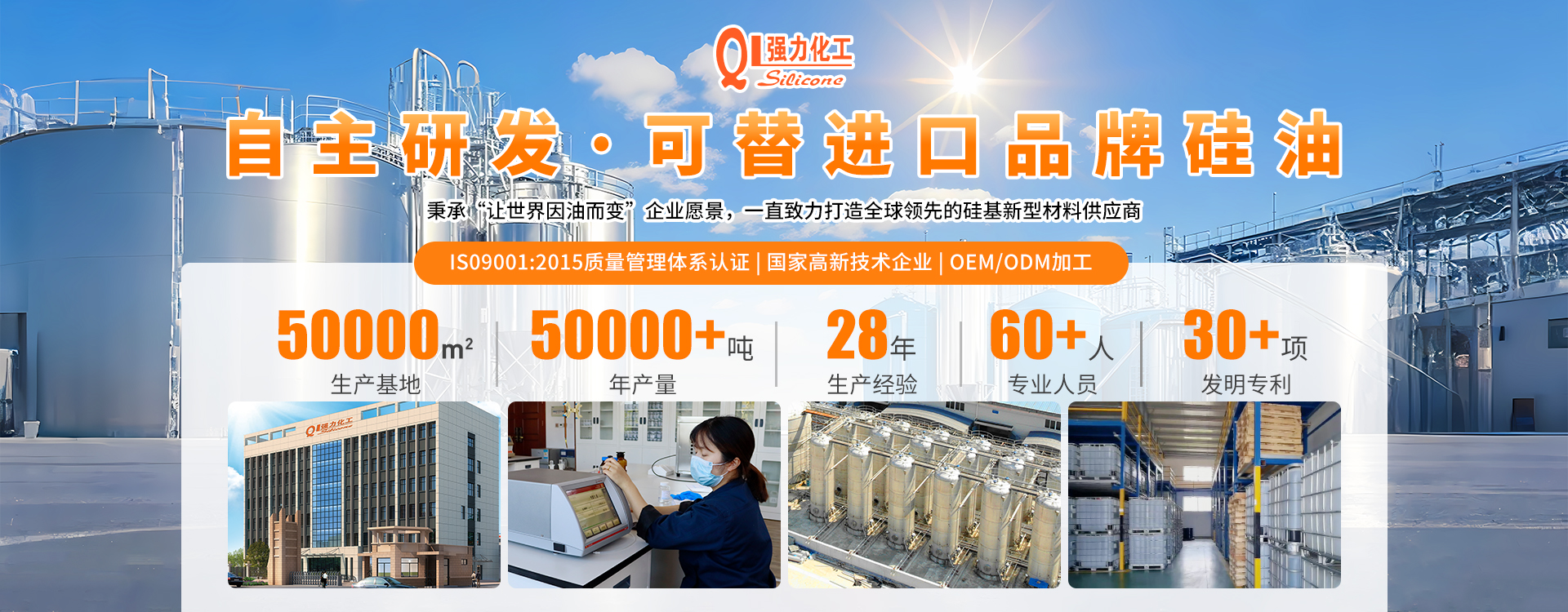◎ 黃山市強(qiáng)力化工有限公司是一家專(zhuān)注于有機(jī)硅新材料,集研發(fā)、生產(chǎn)與銷(xiāo)售為一體的綜合性高新技術(shù)企業(yè)。公司已是有機(jī)硅行業(yè)內(nèi)較為知名的品牌,傾力于打造高品質(zhì)有機(jī)硅產(chǎn)品:二甲基硅油、乙烯基硅油、氨基硅油、乳化硅油、羥基硅油、含氫硅油與紡織品硅油等。砥礪前行,踔厲奮發(fā),強(qiáng)力純硅油,更高技術(shù),更好硅油。秉承“讓世界因油而變”企業(yè)愿景,一直致力打造全球領(lǐng)先的硅基新型材料供應(yīng)商。